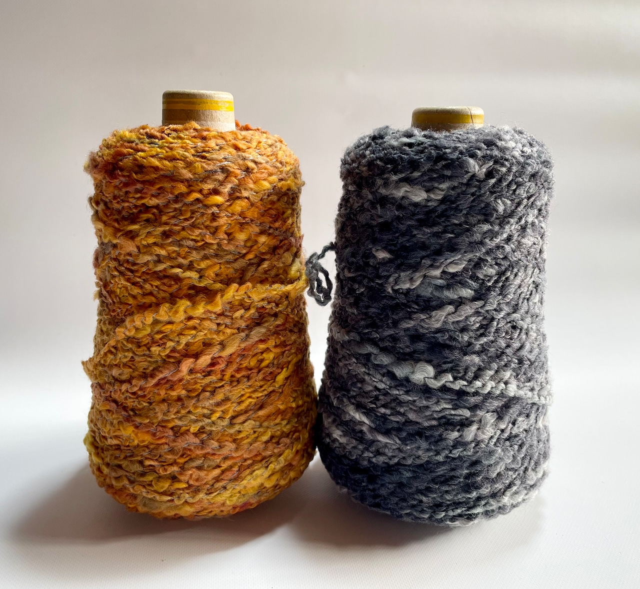 糸の太さが変わる糸で、織って縮絨するととても柔らかくふんわりとした手触りになります。