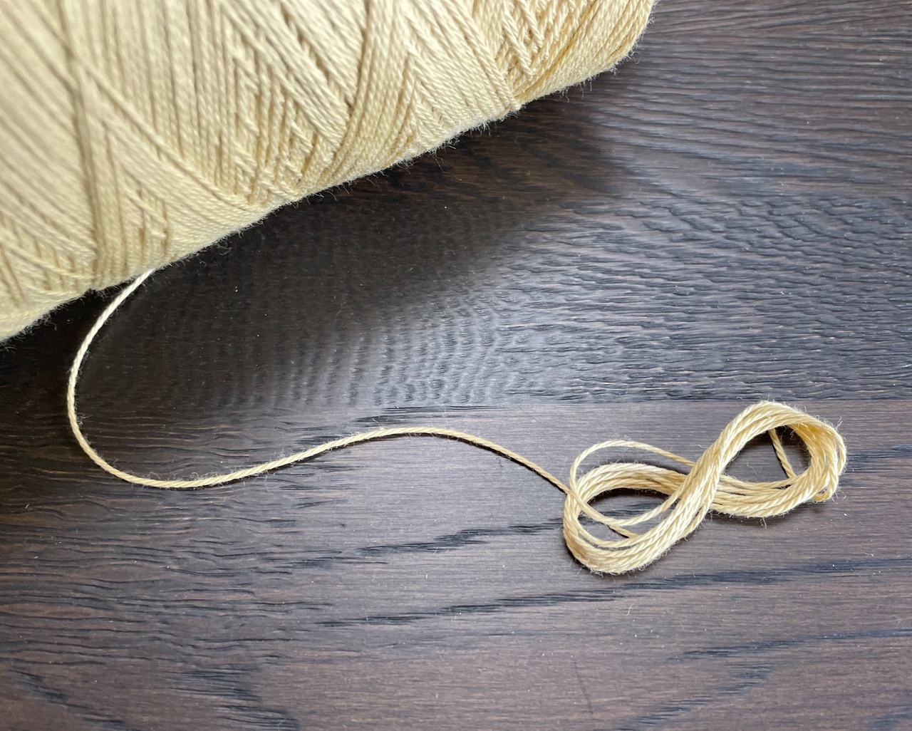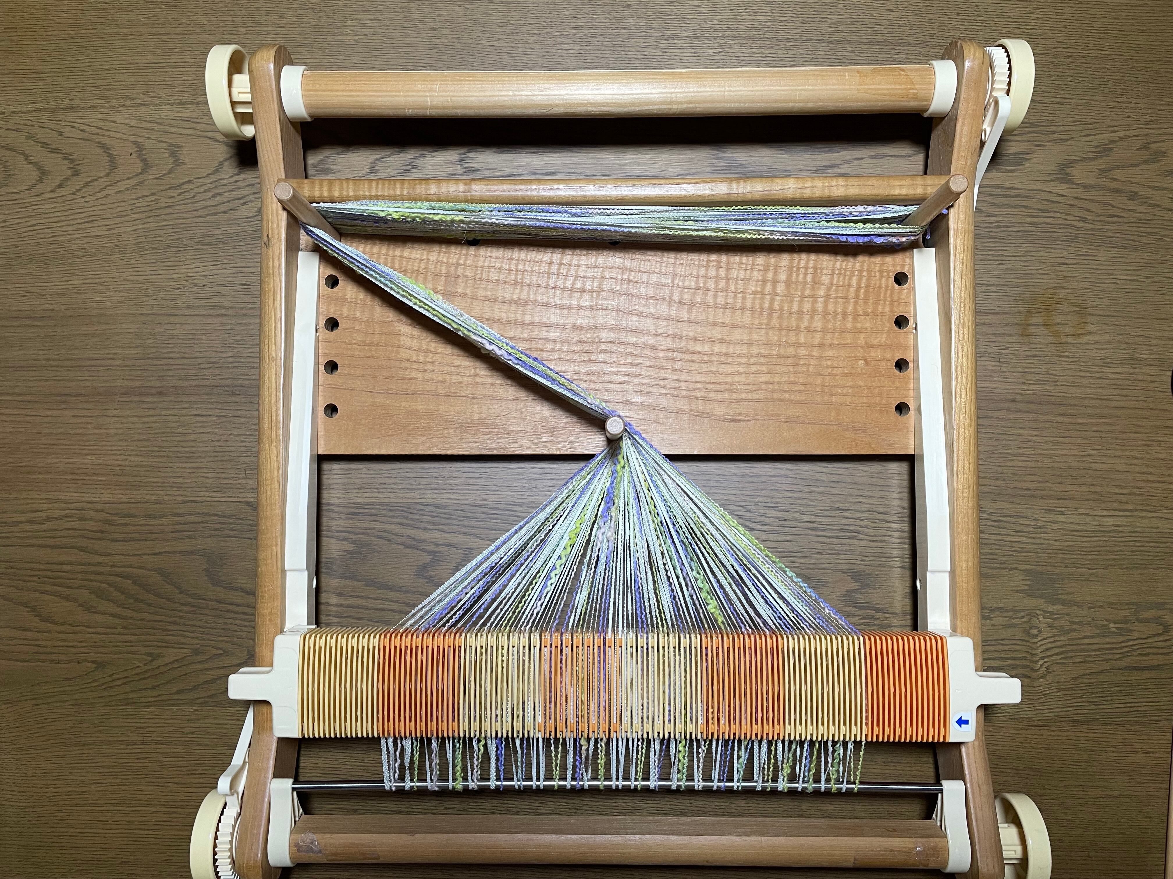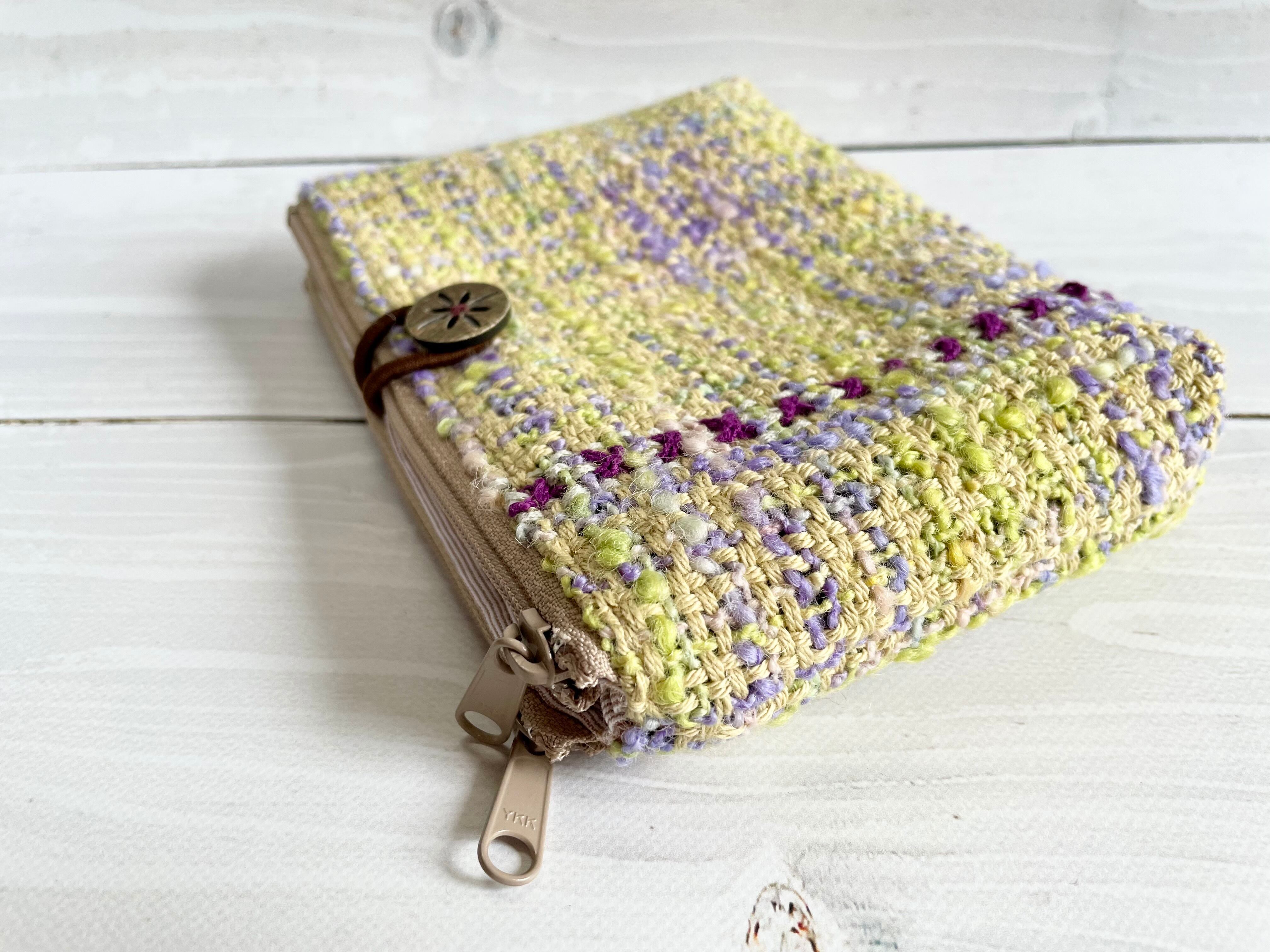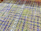 ウール混の段染めスラブ糸と 薄い黄色の綿糸で千鳥格子を織って作ります。ファンシーツイードのような織柄になります。