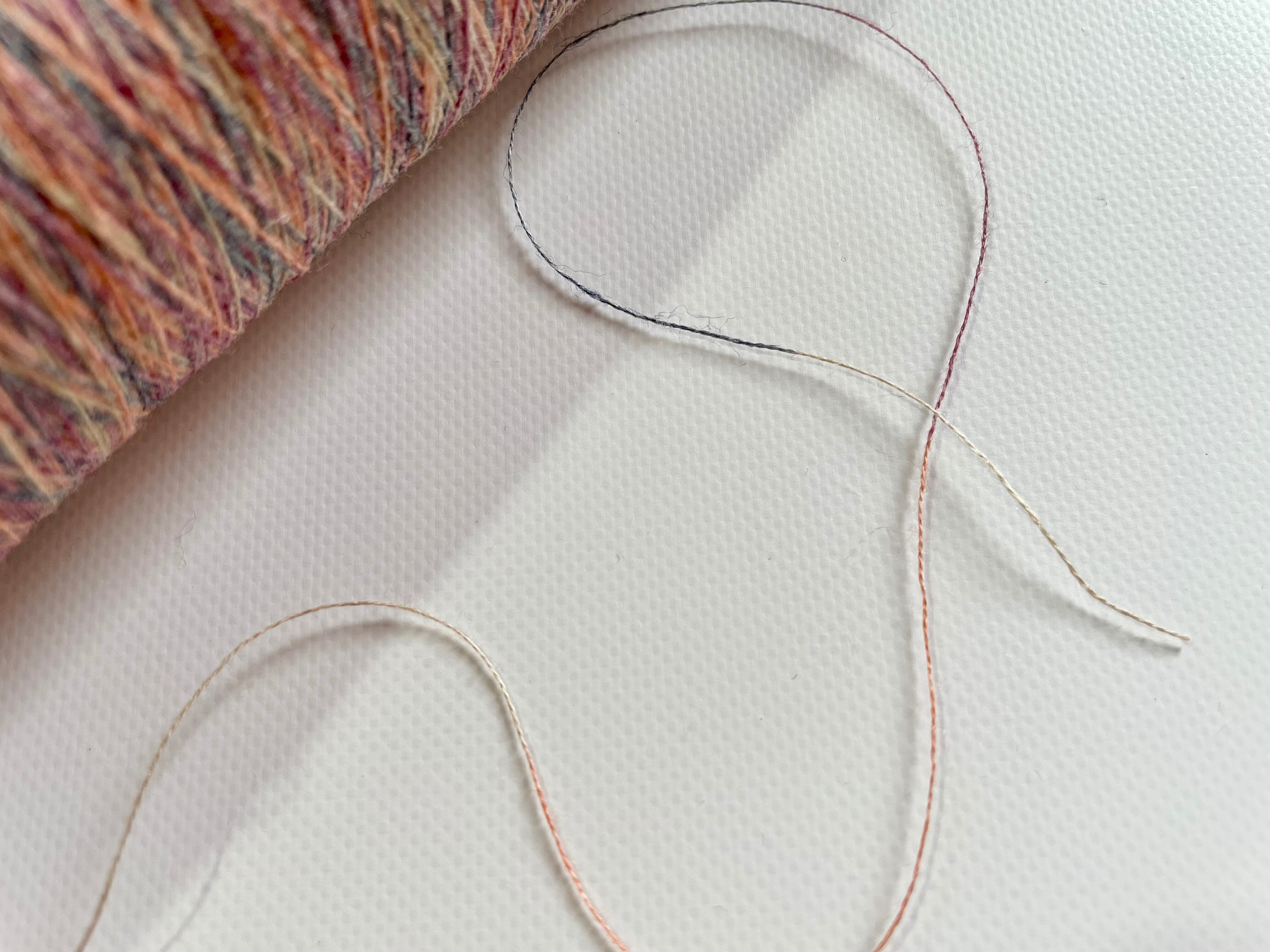 細めの段染め糸です。複数本を引きそろえて使うのに向いています。